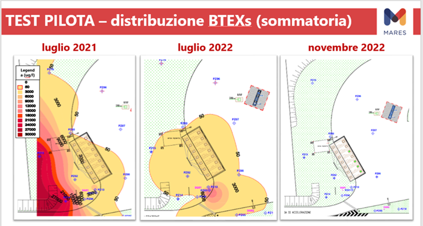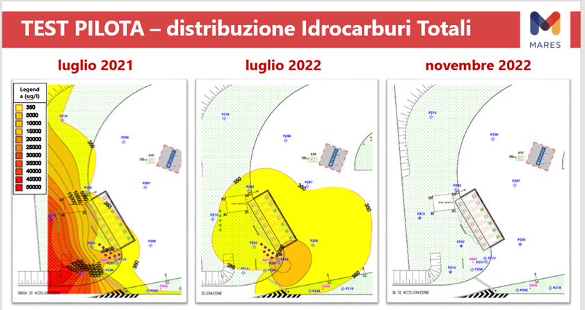 Il test ha comportato un sostanziale abbattimento delle concentrazioni dei contaminanti (in particolar modo idrocarburi e BTEX); le NMP sono risultate in grado di adsorbire e favorire la degradazione dei contaminanti; i dati ottenuti sulla velocità e direzione di falda hanno consentito di progettare accuratamente il posizionamento delle barriere di nanoparticelle in sito per l’applicazione full scale.